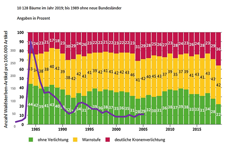 Bundesweit liegen bisher die Daten der Waldzustandserhebung bis zum Jahr 2019 vor. Diese können als Vergleichsmaßstab dienen, wie es in diesen Phasen "dem Wald wirklich ging." Die blaue Linie zeigt dazu die Aktivität der bundesdeutschen Presseberichterstattung (vgl. auch Abb. 2).