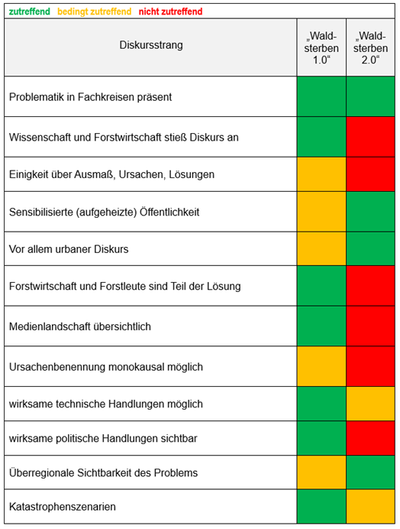 Bei der Betrachtung einzelner Diskursstränge der Waldsterben-Debatten der 1980er Jahre und ab 2019 fallen einige wesentliche Unterschiede und Entwicklungen auf, wie die folgende Tabelle 1 zeigt. Die Thematik ist beide Male stark in den Fachkreisen präsent, wird jedoch hinsichtlich der medialen Aufbereitung unterschiedlich beurteilt, so dass auch die zweite öffentliche Diskurswelle eher extern angestoßen wurde. So differenzieren sich Ansichten zu Ausmaß, Ursachen und Lösungen inzwischen wesentlich stärker in einer weiter aufgeheizten Öffentlichkeit mit unübersichtlicherer Medienlandschaft und weiter zunehmenden urbanem Diskurs. Bedenklich für die Branche ist, dass Forstwirtschaft und Forstleute weniger als Teil der Lösung wahrgenommen werden, sondern vielfach medial und gesellschaftlich als eine Ursache des Problems. Dennoch hielten sich ausgeprägte Katastrophenszenarien im Vergleich zu den 1980er Jahren zunächst noch in Grenzen, obwohl Waldschäden heute auch überregional sichtbarer sind. Sie werden aber vielfach vom globaleren Umweltthema Klimawandel überlagert und dabei thematisch einbezogen. Das macht auch politisches Handeln noch komplexer, da eine lokale Emissionsreduktion heutzutage nicht mehr ausreicht, um das Schadgeschehen positiv zu beeinflussen.