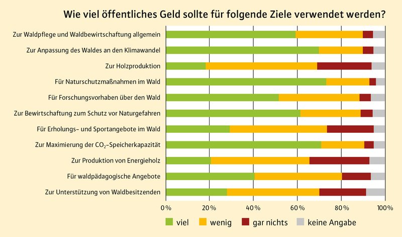 Wetterextreme und Kalamitäten erhöhen den Aufwand für die Waldbewirtschaftung und mindern Erlöse aus dem Holzverkauf. Wer aus Sicht der Bevölkerung für die Waldbewirtschaftungskosten aufkommen soll und welche Zielsetzungen mit öffentlichen Geldern unterstützt werden sollten, ist deshalb von besonderem Interesse.