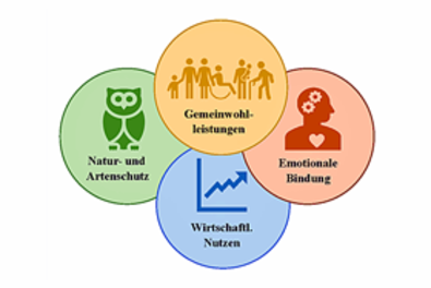 - ergänzende Informationen, etwa zu den Anspruchs- und Leistungsdimensionen des Waldes oder zu forstwirtschaftlichen Zusammenschlüssen.