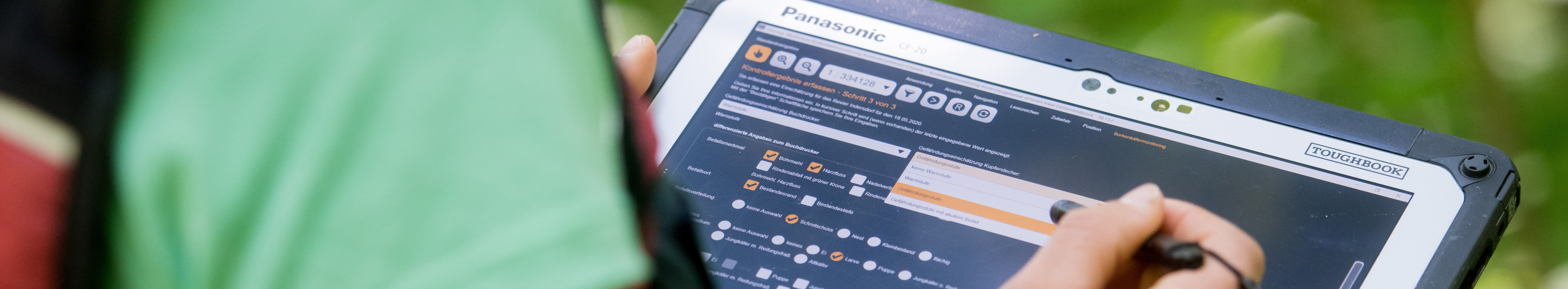 Die öffentlichen Forstverwaltungen erheben regelmäßig – zum Teil über die forstlichen Versuchs- und Forschungsanstalten – abiotisch und biotisch bedingte Veränderungen des Waldzustands. Dazu wird eine immer größer werdende Palette unterschiedlicher digitaler Hilfsmittel genutzt. Die terrestrische Erfassung von Schaderregern und Schadereignissen durch das forstliche Personal der Verwaltungen (Waldschutzmeldewesen) ist etablierter Standard. Die Erhebung und Dokumentation dieser Informationen läuft meist innerhalb betrieblicher, mitunter GIS-basierter Softwarelösungen (z.B. Bayerisches Wald-Informationssystem, BayWIS). Zum Teil stehen dem Personal auch mobile Anwendungen zur Verfügung, welche eine einfache und einheitliche Dokumentation auf dem Endgerät sowie eine bruchlose Datenübertragung ermöglichen (z. B. die Borkenkäfer-App innerhalb des BayWIS; vgl. Abb. 2.2). Eine Besonderheit stellt in diesem Zusammenhang die Anwendung "Schadensmeldungen mobile" als Ergänzung zum Waldschutz-Meldeportal der Nordwestdeutschen Forstlichen Versuchsanstalt (NW-FVA) dar, welche nicht nur von den öffentlichen, sondern auch von privaten Forstbetrieben im Zuständigkeitsbereich der NW-FVA nach einer Registrierung genutzt werden kann.