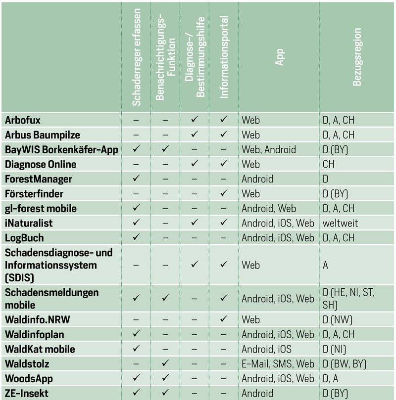 Auch das österreichische Bundesforschungs- und Ausbildungszentrum für Wald, Naturgefahren und Landschaft (BFW) hat ein vergleichbares Schadensdiagnose- und Informationssystem (SDIS) entwickelt, welches über die Angabe der betroffenen Baumteile oder der betroffenen Baumart eine Eingrenzung ermöglicht und zusätzlich zu den Informationen zu den verschiedenen Schaderregern eine interaktive Karte mit bestätigten Fundorten anbietet. Die beispielhaft genannten Anwendungen sind in Abbildung 4 zusammengefasst.