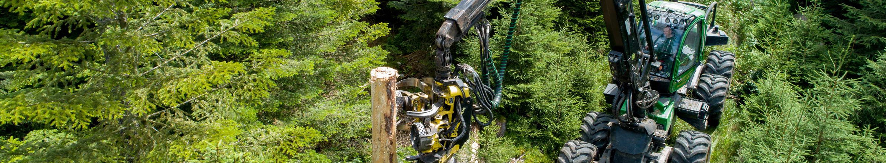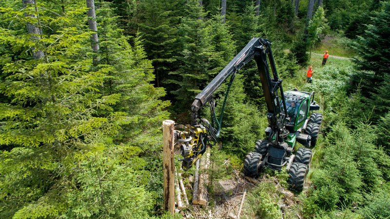 Abb. 1: Zur Forstwirtschaft gehört auch der Naturschutz. Hier bearbeitet ein Harvester einen Hochstumpf, so dass ein Teil des Stammes als stehendes Totholz im Wald verbleiben kann und zukünftig als wertvoller Biotopbaum dient (Foto: Martin Hertel, BaySF)