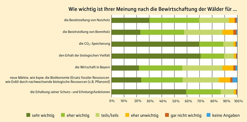 Wie steht die Bevölkerung zum Wald und seinen Funktionen, wie zu seiner Bewirtschaftung und wie sieht sie die Forstwirtschaft? Im Projekt "Soziokulturelles Waldmonitoring Bayern – WaMos Bayern" wurde im Jahr 2020 in Anlehnung an die Untersuchungen aus der Schweiz und Baden-Württemberg eine repräsentative Bevölkerungsumfrage zum Thema Wald erstellt und ausgewertet.