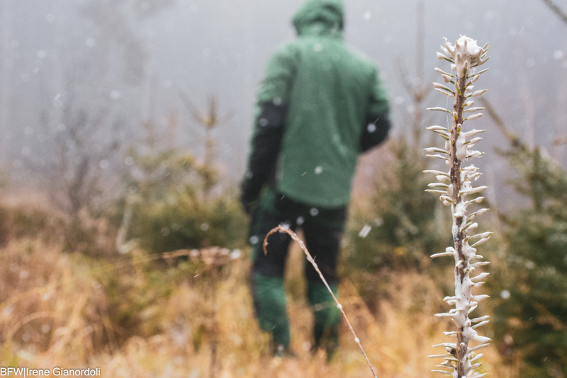 Nach zwei Stunden Anreise trifft sich das Team beim Parkplatz Nebelstein mit einem pensionierten Förster und Jäger, der über den Kooperationspartner Stützpunkt GmbH im Projekt mitarbeitet und mit seiner Erfahrung einen wertvollen Beitrag leistet. „Am Nebelstein gibt's immer Nebel!“, so der Pensionist – treffender könnte die Wetterlage vor Ort nicht beschrieben werden. Schon bei der Ankunft nieselt es – ob es nun Schnee oder Regen ist, ist man sich nicht einig. Jedenfalls hat Michael, einer aus der Arbeitsgruppe, schon am Vorabend im linken Fuß gespürt, dass das Wetter umschlägt.