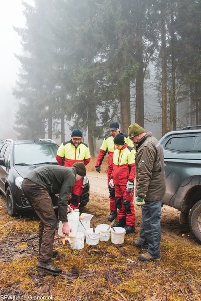 Kurze Zeit später trifft auch der Förster und Gebietsbetreuer des Forstgutes Fürstenberg ein. Gemeinsam fahren alle zur nahegelegenen etwa drei Hektar großen Waldfläche mit jungen Tannen. Diese sollen heute mit einem weißen Pflanzenschutzmittel angestrichen werden, damit die Tannen in den Wintermonaten nicht vom Wild verbissen werden. Dieser Verbissschutz wirkt gegen das Wild sowohl optisch durch die Farbe als auch mechanisch durch die körnige Konsistenz und durch den Geschmack. Angestrichen wird nicht die gesamte Jungtanne, sondern nur der Terminaltrieb, also der Haupttrieb. Das Team vermischt gleich zu Beginn das Mittel mit Wasser und verteilt es in große Kübel.