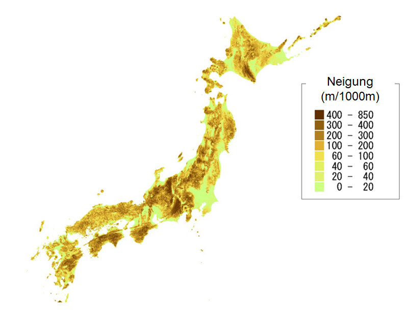 Große Teile des japanischen Waldvermögens befinden sich im Landesinneren, während die deutlich überwiegende Mehrheit der Bevölkerung im Küstenstreifen lebt. Eine, verglichen mit anderen, waldreichen Ländern auffallende Besonderheit Japans ist die enorme Steillage der zentralen Wälder (s. Abb. 2).
