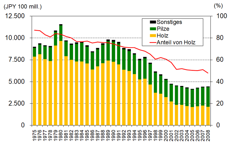 Die nun langjährige Unternutzung der japanischen Wälder hat inzwischen dazu geführt, dass in Japan heute beispielsweise die so genannten „Nebennutzungen“ eine größere Bedeutung haben als die Wertschöpfung der japanischen Forstwirtschaft durch die eigentliche Holzproduktion: im Jahr 2010 erreichte die Wertschöpfung durch die Pilzwirtschaft (Shiitake) 52% der gesamten Bruttowertschöpfung der Forstwirtschaft, während die Holzproduktion nur noch 46% umfasste. Damit setzt sich dieser Trend der abnehmenden Bedeutung der Holznutzung seit Ende der 70er Jahre des 20. Jahrhunderts stetig fort (Abb. 1).