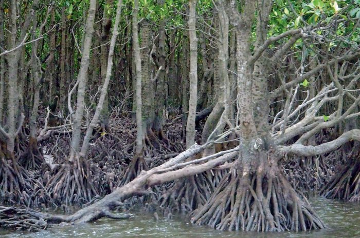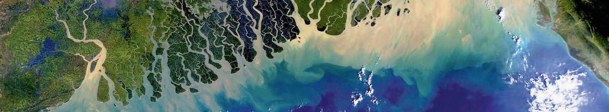 Vom Himalaja angeschwemmtes Material bildet im Mündungsbereich Schlickbänke und Schwemmlandinseln. Ebbe und Flut formen sie ständig um. Zwischen den mächtigen Wurzeln der Mangrovenwälder lagert sich fortwährend neues Material an und lässt das Mündungsgebiet jedes Jahr wachsen. Das weit verzweigte Wurzelwerk der Mangrovengewächse (Rhizophoraceae), die an tropischen Küsten eine immergrüne Waldgesellschaft bilden, sorgt dafür, dass die Sedimentfracht der Flüsse nicht ungebremst ins Meer fliesst und Riffe und Seegraswiesen unter Schlamm verschwinden lässt.