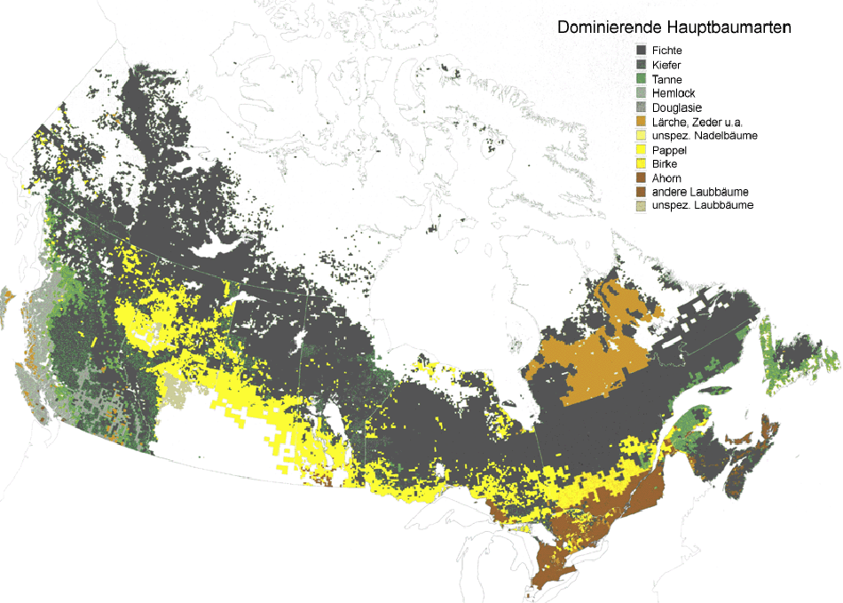 Die mit Abstand größte Waldfläche repräsentieren die Waldgesellschaften der borealen Waldregionen. Sie umfassen mit gut 305 Mio. ha (davon 222,7 Mio. ha Wald i. e. S.) insgesamt 76 % der baumbestandenen Fläche Kanadas. Charakteristische Hauptbaumarten der borealen Waldgesellschaften sind verschiedene Nadelbaumarten und Aspen (Tab. 2, Abb. 4). Des Weiteren befinden sich große Waldflächen von über 10 Mio. ha im Osten in der Laubwaldregion Große Seen - St. Lorenz (25,6 Mio. ha), sowie im Westen in den Nadelwaldgesellschaften der subalpinen Waldregion (15,5 Mio. ha) und der Bergwaldregion (12,2 Mio. ha).