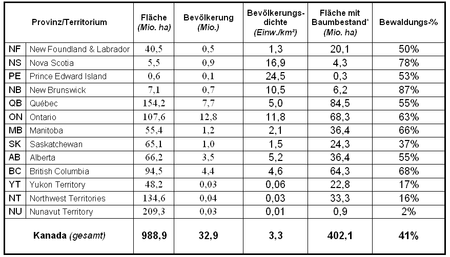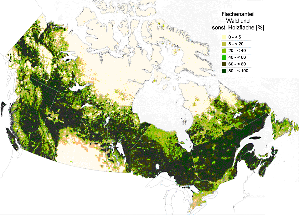 Ausweislich der aktuell verfügbaren Auswertung der kanadischen Forstinventur [2] entsprechen rd. 310 Mio. ha Fläche der Walddefinition im engeren Sinn. Hinzu kommen Flächen von rd. 92 Mio. ha mit schütterem Baumbewuchs, die der Walddefinition im engeren Sinn nicht voll entsprechen (z. B. baumbestandene Moore und Sümpfe oder felsige Flächen mit vereinzelten Bäumen). Im Durchschnitt ergibt sich daraus ein Waldanteil von gut 40 %.