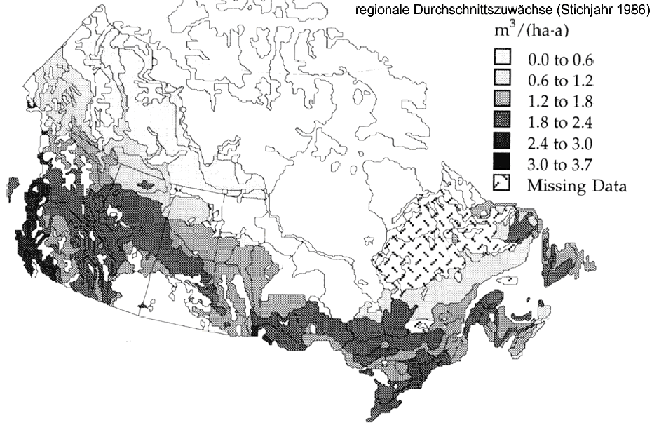 Da die aktuellen Auswertung zum Stichjahr 2001 [2] aufgrund geänderter Inventurmethodik keine Angaben zum Zuwachs enthält, muss hierfür auf frühere Auswertungen zurückgegriffen werden: für das Stichjahr 1986 [6] wies die Inventur für die bestockte Holzbodenfläche einen durchschnittlichen Zuwachs 1,6 m³ je Jahr und Hektar aus (Tab. 2). Das entspricht kanadaweit insgesamt ca. 364 Mio. m³. Die Spanne reicht dabei in den Waldregionen von 0,8 (Tundra) bis 2,31 (Küste) m³ je Jahr und Hektar. Abb. 5 zeigt eine Karte mit regionalspezifischen Hektarzuwächsen für das Stichjahr 1991 [7].