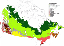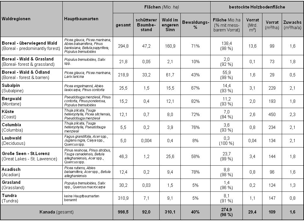 Die kanadische Waldinventur ordnet die Wälder 15 terrestrischen Ökozonen zu bzw. gliedert sie in 12 Waldregionen (Abb. 3, Tab. 2). Da die terrestrischen Ökozonen immer Anteile verschiedener Waldregionen aufweisen bezieht sich die folgende Darstellung der Klarheit halber ausschließlich auf die forstlich konsistente Gliederung nach den Waldregionen.