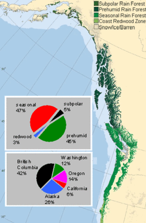 Die weltweit größte Ausdehnung erreichen Küstenregenwälder im pazifischen Nordwesten Nordamerikas: Die ursprüngliche Fläche von ca. 25 Mio. Hektar zieht sich in einem schmalen Band entlang der Pazifikküste von Nord-Kalifornien über Oregon, Washington, British Columbia bis in den Südosten Alaskas (Abb. 2). Dies entspricht etwa der Hälfte der Fläche aller Küstenregenwälder weltweit. Klimatisch kennzeichnend sind im pazifischen Nordwesten die außerordentlich hohen Niederschläge (teilweise über 3.000 mm) und ein ausgeglichenes Temperaturregime im Sommer wie im Winter. Die Temperaturen bewegen sich das Jahr über selten außerhalb eines Bereichs zwischen 10-24° C.
