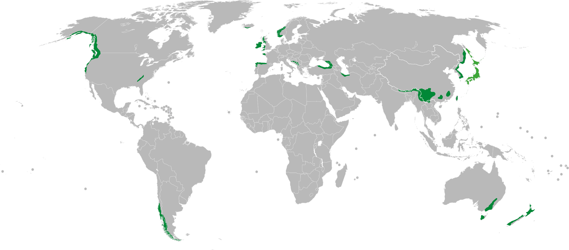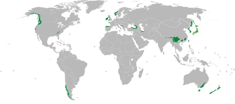 Abb. 1: Ursprüngliche Verbreitung von Regenwäldern der gemäßigten Klimate.Von KarlUdo - Eigenes Werk, CC BY 3.0