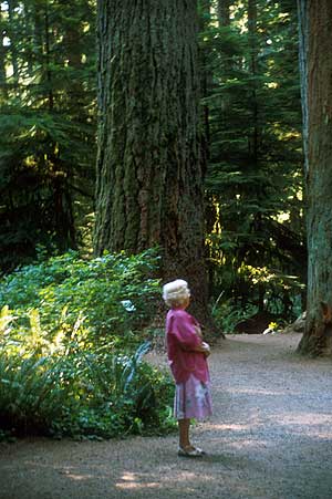 Abb. 3: 80-jähriger Mensch vor 800-jähriger Douglasie. Catherdral Grove im McMillan Bloedel Provincial Park auf Vancouver Island, British Columbia/Kanada. (Foto: U. Kohnle)