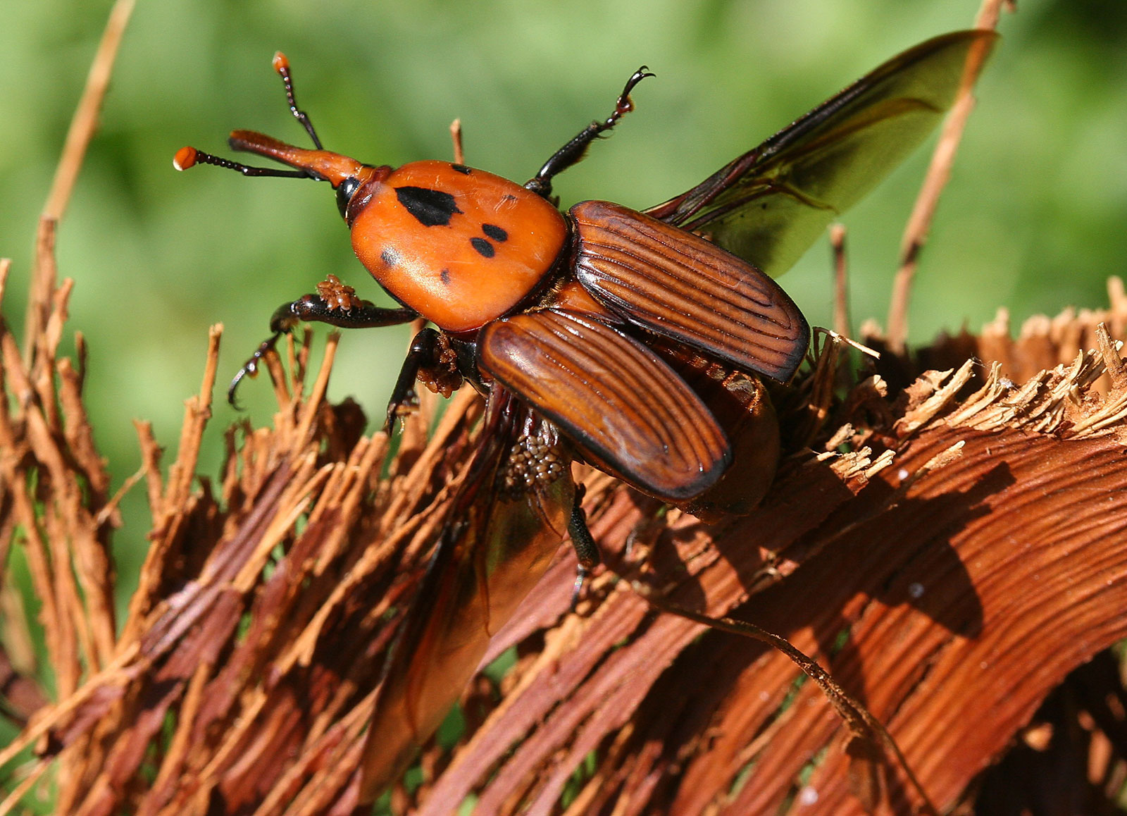 Allerdings bietet sich Einheimischen und Touristen in Italien, Spanien, auf den Balearen und den Kanarischen Inseln mittlerweile der Anblick schwer geschädigter oder absterbender Palmen. Grund hierfür ist der Palmenrüssler (Rhynchophorus ferrugineus), der aus Südostasien stammt und erstmals 1994 nach Spanien eingeschleppt wurde. Inzwischen hat sich der zwei bis drei Zentimeter große, rotgefärbte Käfer in nahezu allen Mittelmeerländern ausgebreitet und allein im Jahr 2005 im Süden Spaniens mehr als 3.000 Palmen zum Absterben gebracht.