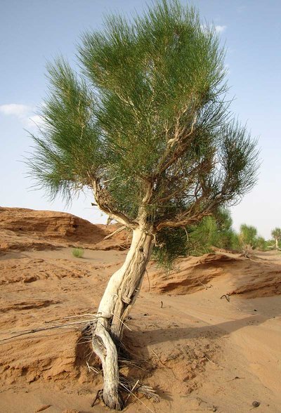 Der Saxaul (Haloxylon ammodendron) ist ein zwei bis vier Meter hoher Strauch bzw. niedriger Baum. Seine Blätter sind zur Wasserersparnis nur noch dünne Stränge, die Äste wirken dadurch wie Ruten (Abb. 1). Sein Holz stellt neben getrocknetem Viehdung die wichtigste Brennstoffquelle für die Nomaden in den ariden Halbwüsten des zentralasiatischen Bereichs dar. Außerdem dient er dem Erosionsschutz und ist Habitat für spezielle Vogelarten wie Saxaul-Sperling und Saxaul-Häher.