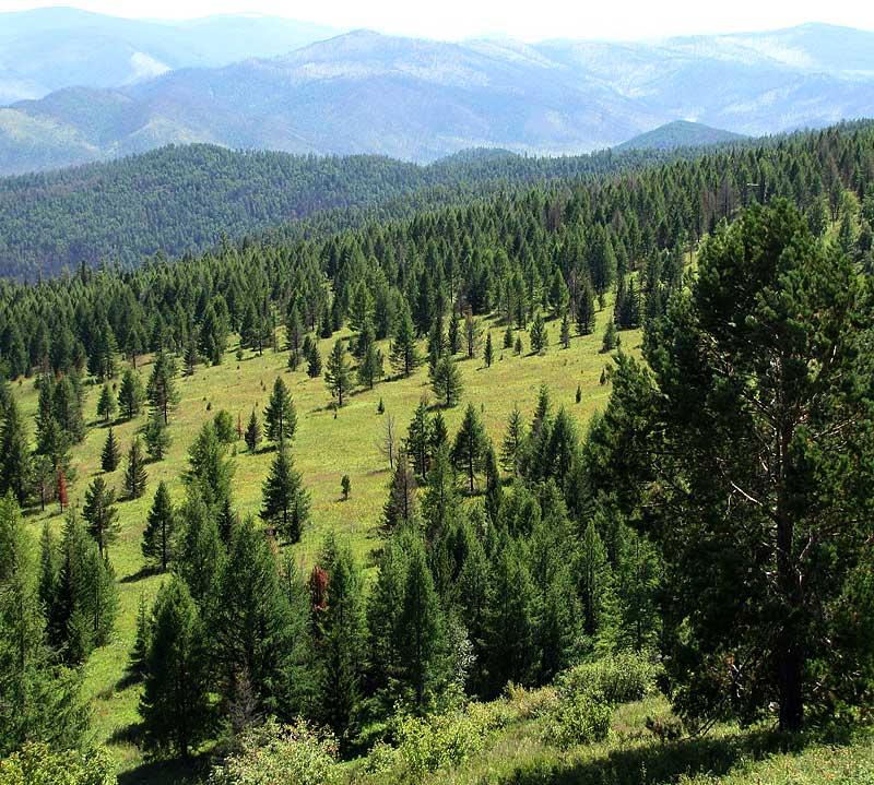 - Süd-Baikal-Bereich: grenzt im Norden an Russland an; Hauptbaumarten sind Sibirische Lärche (Larix sibirica), Waldkiefer (Pinus sylvestris), Sibirische Zirbelkiefer (Pinus sibirica) und Mandschurische Birke (Betula platyphylla)