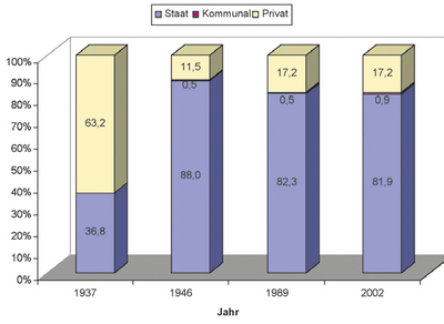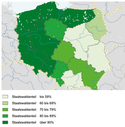 In manchen Wojwodschaften Ost- und Südpolens liegt dabei der Privatwaldanteil bei fast 50%. Die Enteignungen betrafen nach 1945 nur den Grossprivatwald, den Privatwald in den Händen juristischer Personen und den Kirchenwald. Der weitaus grösste Teil der Verstaatlichungen erfolgte in den seit 1945 zu Polen gehörenden ehemaligen deutschen Ostgebieten, wo das gesamte Waldeigentum in deutschen Händen verstaatlicht wurde. Noch heute ist dies am Staatswaldanteil der entsprechenden Wojwodschaften zu erkennen (Abb. 5). Diese Sonderentwicklung Polens in sozialistischer Zeit hat den innenpolitischen Druck auf die jeweiligen Regierungen zur Einleitung eines Restitutionsprozesses beim Waldbesitz nie sonderlich stark werden lassen.