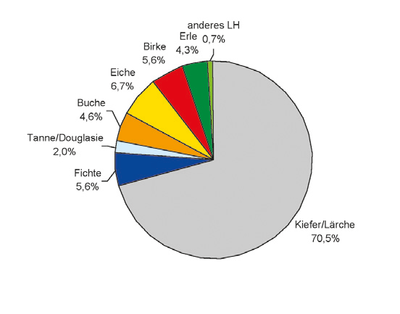 Brotbaum der polnischen Forstwirtschaft ist die Kiefer, die gemeinsam mit der Lärche rund 70% der Waldfläche bestockt (Abb. 3) und damit das wirtschaftliche Rückgrat der meisten Forstbetriebe darstellt. Die Altersstruktur der polnischen Wälder ist geprägt durch einen Überhang der zweiten (21–40 Jahre) und dritten Altersklasse (41–60 Jahre).