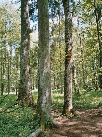 Abb. 6. In der Region des bekannten Bialowieza Nationalparks sind natürlicherweise vor allem Eichen, Buchen, riesige Exemplare der Schwarzerle, vereinzelt bis horstweise Fichte und Spitzahorne verbreitet. Neben Buchen-Hallenwäldern (analog wie bei uns im Mittelland) findet man Hagebuchen-Eichenwälder, Eichenwälder sowie feuchte Erlen-Eschenwälder.