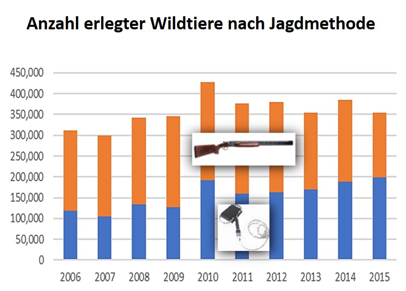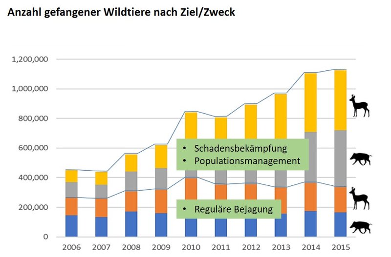 In der Folge werden derzeit mehr Tiere durch diese beauftragten Jäger erlegt, als durch private Jagdausübende (Abb. 6). Die Jagdausübung durch Privatpersonen ist wegen des geringen Ansehens der Jagd in der Öffentlichkeit und das mangelnde Interesse an Wildfleisch eher selten.