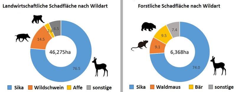 Betrachtet man die Schadensfläche nach Tierarten unterteilt, so fällt auf, dass sowohl in der Landwirtschaft als auch in der Forstwirtschaft das Sikawild für nahezu 75% aller Schäden verantwortlich ist (Abb. 5). Was jedoch die geldwerten Schadenssummen in der Landwirtschaft betrifft, so machen ebenfalls Schwarzwildschäden einen bedeutenden Anteil (37%) aus, was diese Tiere neben dem Sikawild (41%) zum größten Feind der Landwirtschaft macht (MAFF, 2020). Die rechnerische Schadenssumme belief sich im Jahr 2020 im Bereich der Landwirtschaft auf rund 130 Mio. Euro. Die finanziellen Schäden in der Forstwirtschaft werden nicht erfasst.