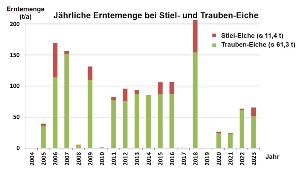 Bei der Eiche wechseln sich Zeiten der kontinuierlichen Versorgung (2011 bis 2016) mit Phasen von Fehl- und Sprengmasten (2019 bis 2021) ab. Dabei fruktifizierten in der ersten Phase nicht dieselben Bestände jährlich, sondern jeweils Bestände verschiedener Regionen Brandenburgs. Bei Eiche sind mehrere Fehlmasten hintereinander besonders nachteilig, da sich das Saatgut trotz intensiver Forschungsarbeiten in der Vergangenheit nicht längerfristig lagern lässt. Nur durch unterschiedliche Baumschulsortimente und die Ausnutzung von Wildlingen lassen sich diese Phasen teilweise überbrücken.