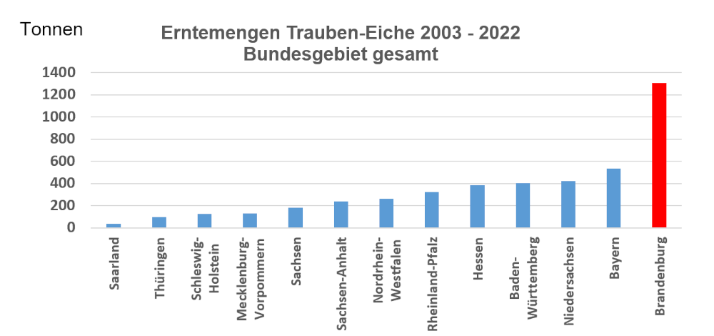 Wo Brandenburg bei den Ernteaktivitäten im Vergleich zu anderen Bundesländern steht lässt sich auf Basis der Erntestatistik der BLE (2024) einschätzen. Bei Trauben-Eiche betrug die Erntemenge zum Beispiel mehr als das Doppelte als im an zweiter Stelle liegenden Flächenland Bayern mit dem bekannten Trauben-Eichen-Gebiet Spessart.