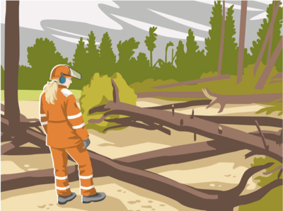 Auch im Wald hinterlässt ein Sturm Gefahren. Es entstehen dort komplexe Situationen aus umgeworfenen, entwurzelten, abgebrochenen, geknickten und hängen gebliebenen Bäumen oder Baumteilen. Wer Sturmholz aufrüstet, muss geplant und fachgerecht vorgehen, sonst kommt es rasch zu schweren Unfällen. Ohne eine besondere Ausbildung und die richtige Ausrüstung ist es lebensgefährlich. Der Einsatz geeigneter Maschinen und Hilfsmittel – zum Beispiel Vollernter und Kranfahrzeuge – senkt das Unfallrisiko markant.