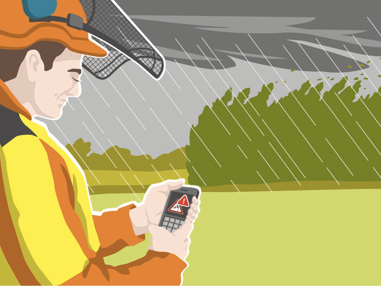 Zum Glück warnen heute Wetter-Alarm-Apps via Smartphone zuverlässig, wenn Gefahr durch Unwetter droht. Ein Wetter-Alarm gehört deshalb aufs Handy jedes Verantwortlichen für Arbeitseinsätze an gefährdeten Orten. So bleibt auch genügend Zeit, nicht nur sich selbst in Sicherheit zu bringen, sondern vorher zum Beispiel auch Arbeitsplätze im Freien sturmfest zu machen.