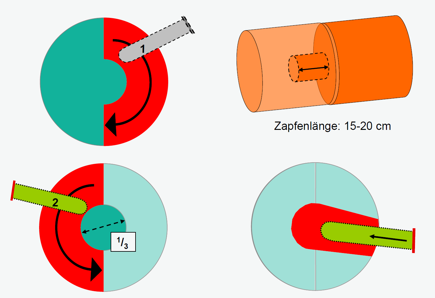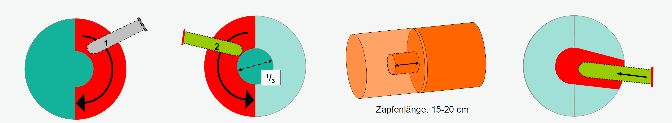 Nach dem Stechschnitt verkeilt sich der 15 bis 20 cm lange Haltezapfen im Zapfenloch, so dass sich der Stamm nicht vom Wurzelteller lösen kann. Der Motorsägeführer kann nun den Gefahrenbereich verlassen. An der durch den Zapfenschnitt entstandenen Soll-Bruchstelle wird der Stamm anschliessend maschinell vom Wurzelteller gelöst. Hierzu ist erforderlich, dass eine Knickbewegung auf die Soll-Bruchstelle ausgeführt wird. Der einfachste Weg dies zu erreichen ist, den Wurzelteller mittels Seilwinde oder Bagger in seine Ausgangsposition zurückzukippen. Harvester knicken den Zapfen, indem sie den Stamm anheben oder seitlich wegschwenken.