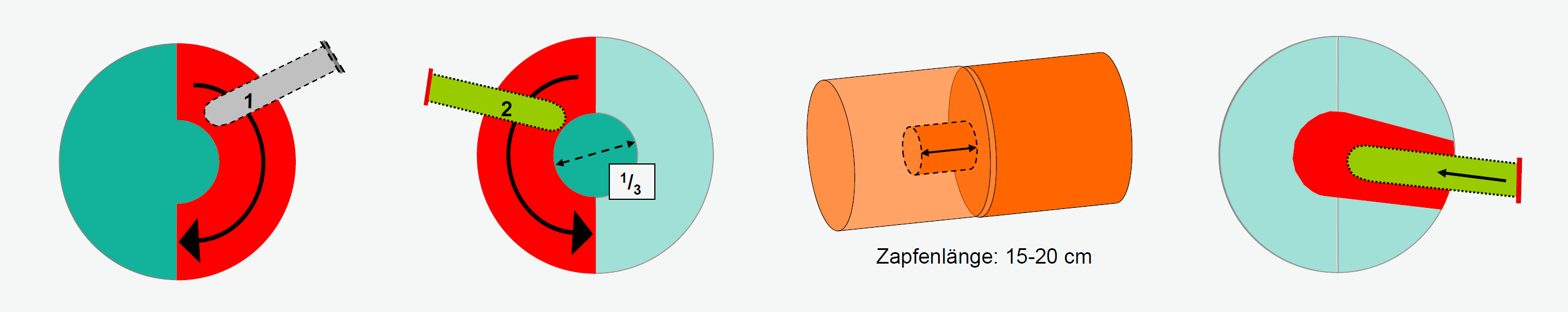 - Im zweiten Schritt wird der Haltezapfen mit einem 15 bis 20 cm zum Wurzelteller hin versetzten Stechschnitt abgetrennt (Abb. 2, Abb. 4). Der Schnitt wird lediglich so tief geführt, dass alle Fasern des Haltezapfens durchtrennt sind (nicht "durchstechen").