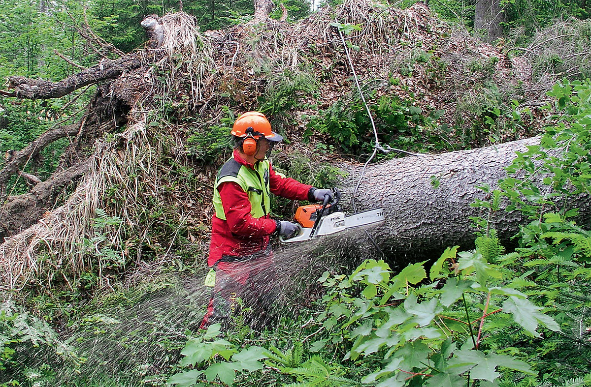 So oder so gilt, dass ein gekippter Wurzelstock, wenn er auf die Sägeführer-Seite zu fallen droht, mit einer Seilwinde oder dem Seilzug gesichert werden muss. Wer ohne entsprechende Ausbildung Sturmholz aufrüstet, gefährdet sich und seine Umgebung grobfahrlässig.