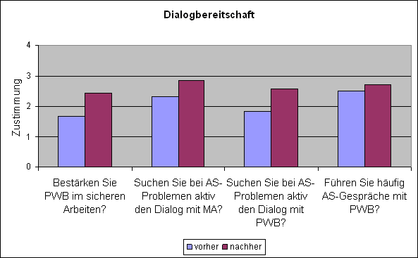Die Überlegung, eine solche Veranstaltung nach einem mehrtägigen Einführungsseminar als eine Art Workshop in regelmäßigen Abständen zu wiederholen, um die Nachhaltigkeit der Veränderungen und eine stete Verbesserung der Führungsqualitäten bei den Revierleitern zu erreichen, erscheint nach den Ergebnissen der Evaluation der Fortbildung eine sinnvolle Möglichkeit für die Verbesserung der Arbeitssicherheit zu sein. Die Revierleiter könnten sich untereinander über Probleme und Erfolge austauschen und Rat und Hilfe von Fachleuten erhalten.