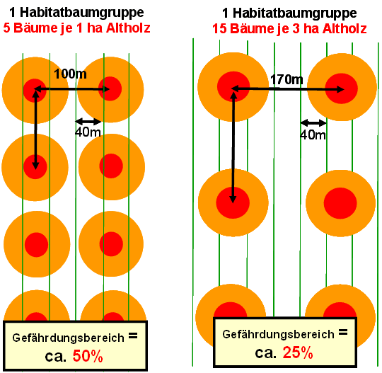 Aus dieser einfachen Erkenntnis heraus und um den Anforderungen der Arbeitssicherheit ausgewogen gerecht zu werden, wurde das ursprüngliche Ansinnen, ca. 5 Habitatbäume als HBG je 1 ha auszuweisen, aufgegeben und auf ca. 15 Bäume je 3 ha erweitert. Allein damit wird erreicht, dass sich die potenzielle Gefährdungsfläche halbiert. Weitere sicherheitsrelevante Bestandteile des AuT-Konzepts und ihre Auswirkungen auf die Arbeitssicherheit sind aus Tab. 1 ersichtlich.