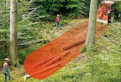 Lebensgefährlich: Raus aus dem Bereich der zuziehenden Last! (Grafik: SVB-Merkblatt, Holzbringung, 2003)