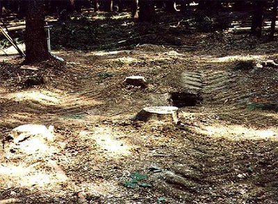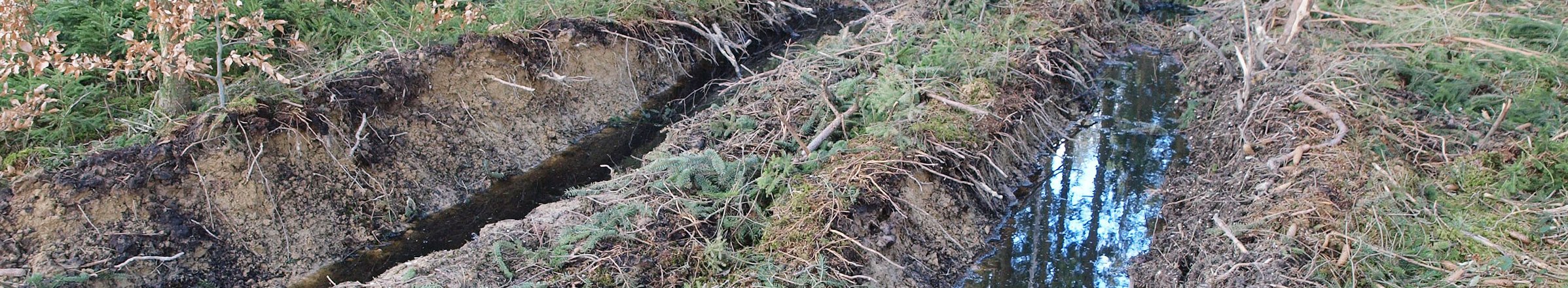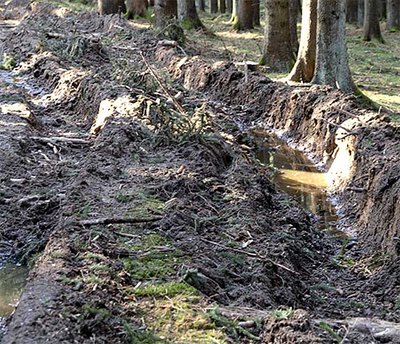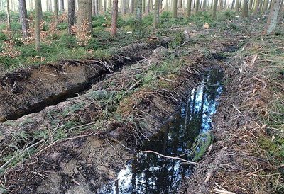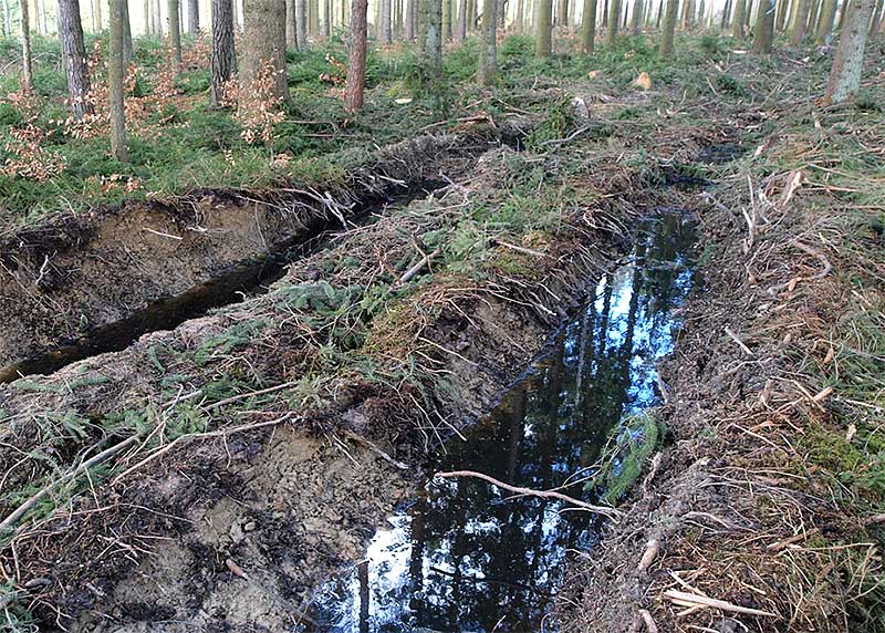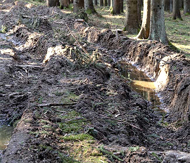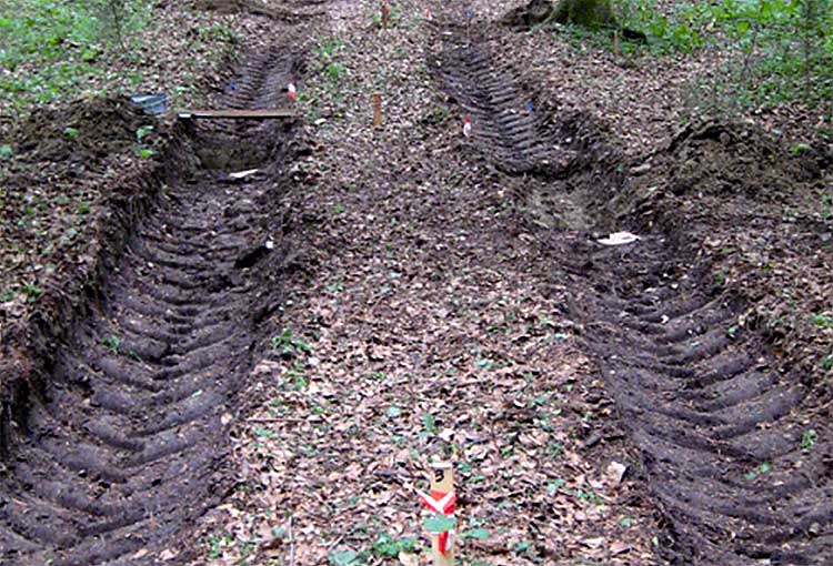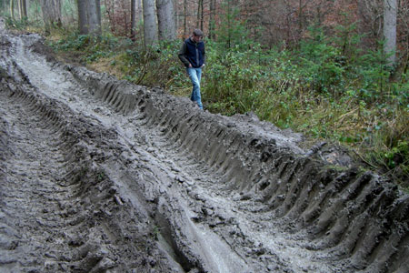 - Plastische Verformung: Ist der Bodendruck höher als die Tragfähigkeit des Bodens, kommt es zu einer plastischen Verformung. Die Spur des Fahrzeugs ist deutlich zu erkennen und liegt tiefer als der umgebende Waldboden. Hierbei kommt es zu einer Reduktion des Porenraums, vor allem der Grobporen, der Boden wird verdichtet (Abb. 6).