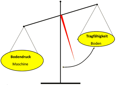 Sind der Bodendruck der Maschine und die Tragfähigkeit des Bodens im Gleichgewicht, ist eine Befahrung unproblematisch. Erst wenn der Bodendruck die Tragfähigkeit des Bodens übersteigt (Abb. 8), kann es zu Bodenschäden kommen. Das Risiko steigt auf Seiten des Bodendrucks mit höherer Radlast, einem höheren Reifeninnendruck und einer geringeren Reifenbreite. Die Tragfähigkeit des Bodens ist bei einer feinen Bodenart mit hohem Wassergehalt und einer steilen Hangneigung am geringsten.