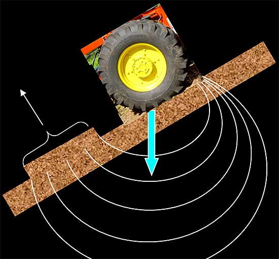 Entstehen Bodenschäden, sind diese meist nicht in der Holzernte durch den Harvester, sondern in der Holzrückung begründet, da ein Forwarder im beladenen Zustand ein in der Regel ungleich höheres Gewicht aufweist. Dieses Gewicht verteilt sich auf die vorhandenen Achsen und Räder, wobei die Radlast unter dem Rungenkorb höher ist als die Radlast unter der Fahrerkabine (Abb. 2). Neben der Anzahl der Achsen und Räder spielt auch die Aufstandsfläche eine entscheidende Rolle. Denn je größer die Aufstandsfläche eines Reifens, desto geringer ist der mittlere Konktaktflächendruck oder Bodendruck. Dieser Druck verteilt sich im Boden in einer sogenannten Druckzwiebel (Abb. 3). Der Verlauf dieser Druckzwiebel ist der Grund, warum es in Hanglagen durch Schlupf vermehrt zu Bodenschäden kommen kann (Abb. 4).