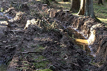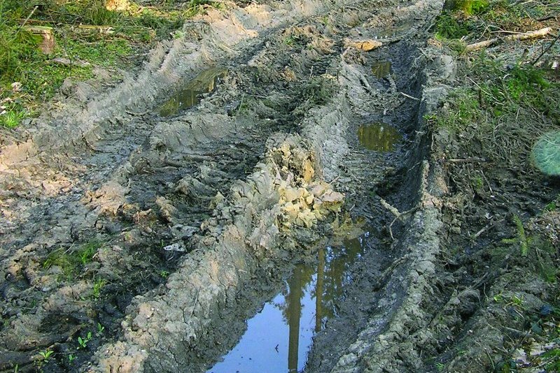 - Viskoplastische Verformung: Bei sehr schlechten Bedingungen, wenn der Bodendruck die Tragfähigkeit weit überschreitet, kommt es zu einer viskoplastischen Verformung, zum Bodenfließen. Hier ist die Spur nicht nur tieferliegend und deutlich erkennbar, es bilden sich am Rand der Fahrspur auch Wülste. Bei diesem sogenannten Grundbruch kommt es zwar kaum zu Verdichtungen, aber zu einer Umorientierung des Porenraumes. Die Porenvernetzung geht verloren, weshalb die Wasserleitfähigkeit stark beeinträchtigt wird. Dieser Zustand bleibt erhalten, auch nach Jahrzehnten ist oft keine Regeneration erkennbar (Abb. 7).