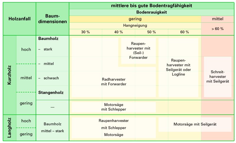 Abbildung 4: Verfahrensauswahl in Abhängigkeit von Holzanfall, Bodentragfähigkeit und Hangneigung (Quelle: Weber, R.; Frutig, F.; Gloor, M.; Wald und Holz, 2004)