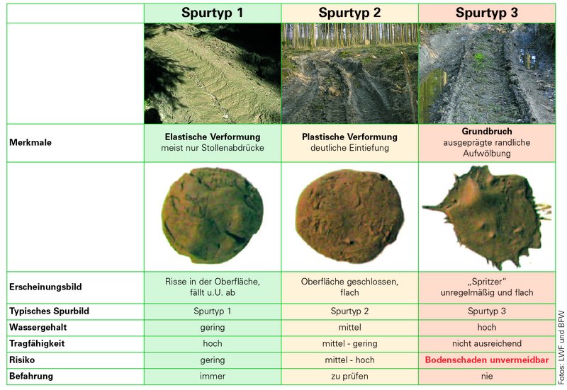 Die Bayerische Landesanstalt für Wald und Forstwirtschaft (LWF) empfiehlt unmittelbar vor der Befahrung einen einfachen Test durchzuführen, indem ein aus dem zu befahrenden Bodenmaterial geformtes Kügelchen mit mäßigem Schwung an eine glatte Oberfläche geworfen wird. Das Erscheinungsbild des Kügelchens nach dem Wurf gibt einen Hinweis auf die Befahrbarkeit des Bodens (nachfolgende Abbildung 3, Wurftest nach LWF, Merkblatt 22).