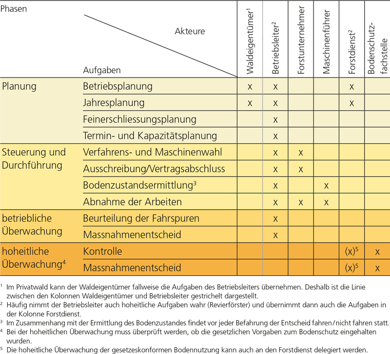 Für die Umsetzung des physikalischen Bodenschutzes sind zahlreiche Akteure verantwortlich (Abb. 5): Waldeigentümer, Forstbetrieb, Forstunternehmer und kantonaler Forstdienst. Der kantonalen Bodenschutzfachstelle obliegt als zuständigem Vollzugsorgan die Überprüfung der einzuhaltenden gesetzlichen Vorgaben. Das BAFU, die Forschungsanstalt WSL und die Ausbildungsstätten bieten Hilfe bei der Umsetzung.