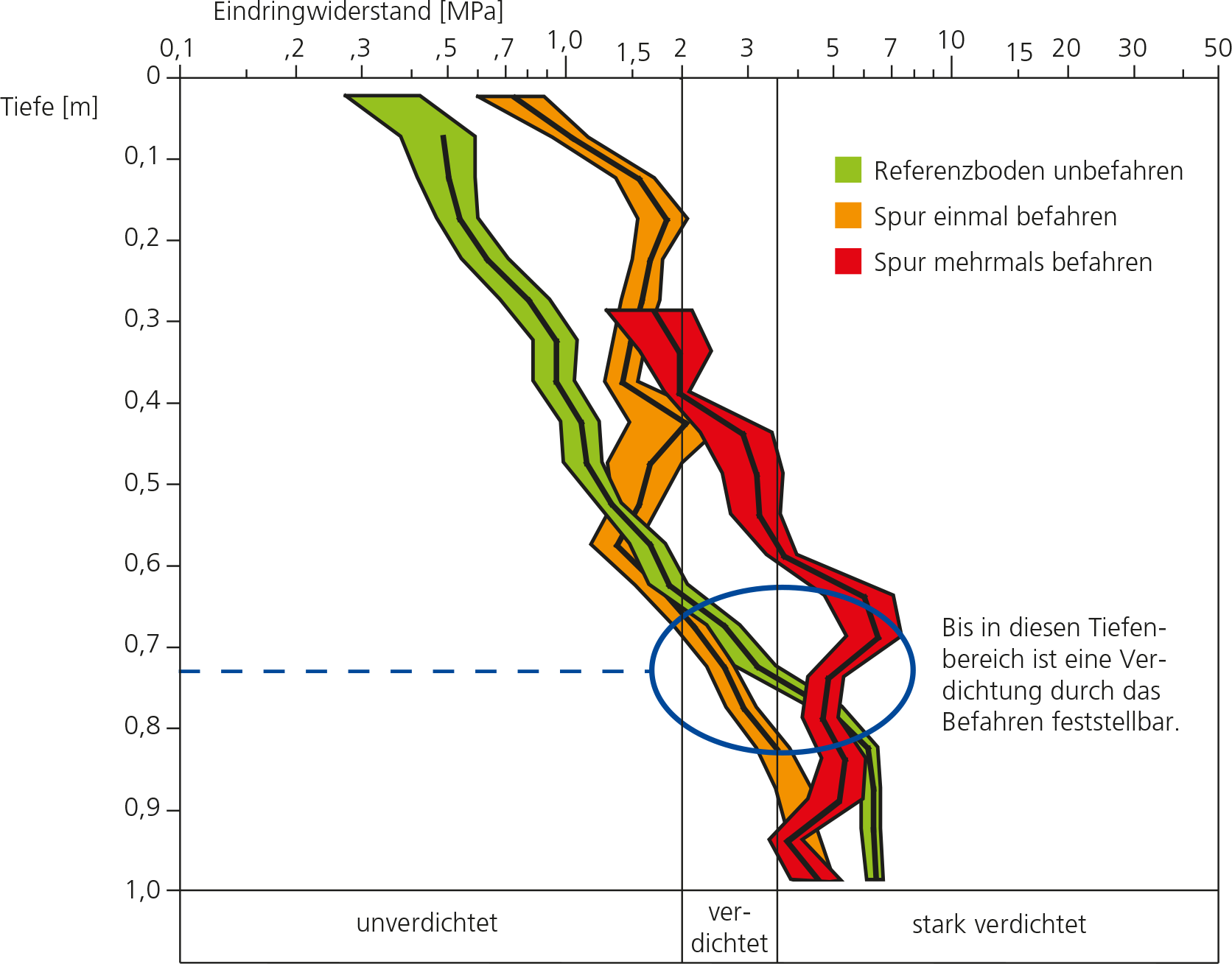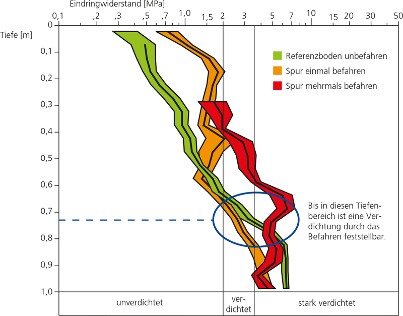 Die Konsequenzen des Befahrens sind nicht nur im Oberboden zu finden, sondern auch im Unterboden. Verdichtungen im Unterboden werden vor allem durch hohe Radlasten verursacht. Untersuchungen mit einem Messgerät, das den Eindringwiderstand des Bodens misst, zeigen eine Zunahme des Eindringwiderstandes bis zu einer Tiefe von 70 bis 80 cm (Abb. 4).