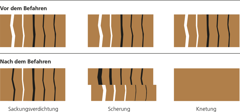 Abb. 2. Das Befahren bewirkt Veränderungen im Boden. Eine Sackungsverdichtung führt zu einer Verringerung des Grobporenvolumens. Bei einer Scherung werden die Bodenporen abgeschert, sie sind danach nicht mehr durchgängig. Knetung bedeutet die Zerstörung der Bodenstruktur (Quelle: Tobias et al. 1999, abgeändert).