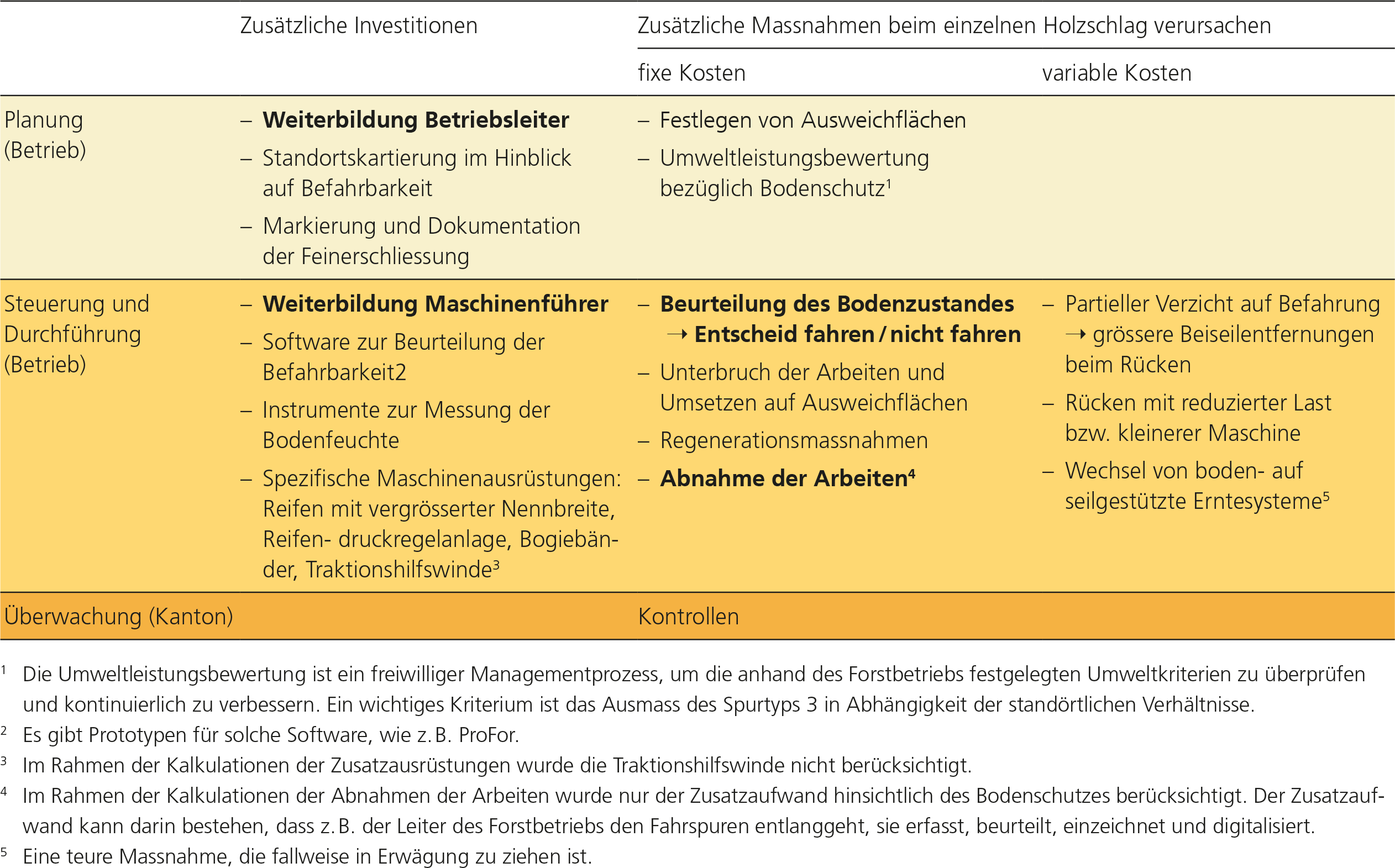 Abb. 7. Die Kosten für den physikalischen Bodenschutz bei der Waldbewirtschaftung hängen von den standörtlichen und betrieblichen Verhältnissen ab. Die untere Kostengrenze ergibt sich aus den grundlegenden Massnahmen, die in der Tabelle hervorgehoben sind. Im Einzelfall können die Kosten, je nach notwendigen Massnahmen, stark ansteigen.