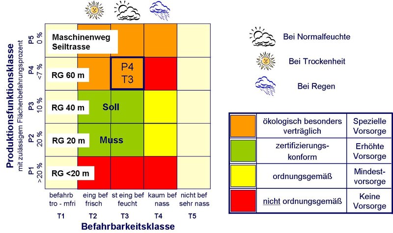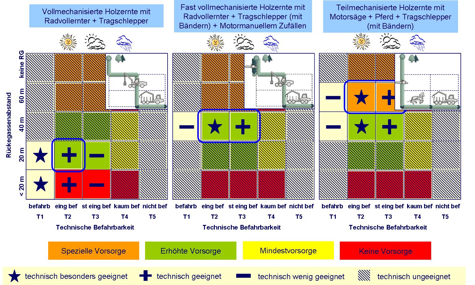 Die Abb. 5 zeigt die Verschneidung des Standortstechnogramms P4T3 (eutrophe, (wechsel)feuchte Standorte) mit den Ökogrammen der drei beispielhaft ausgewählten Holzernteverfahren und veranschaulicht damit das Prinzip der kombinierten, standörtlich-technischen Verfahrensbewertung. Durch einfache Entschlüsselung der verwendeten Farb- und Zeichensymbole wird das Bewertungsergebnis offensichtlich. Die dicke blaue Umrandung kennzeichnet die mit dem jeweiligen Verfahren erreichbare, standörtlich-technische Optimalität. Erst nach dieser standortsindividuellen Filterung einsatzgeeigneter Verfahren kann in einem weiteren Auswahlschritt das wirtschaftlichste oder auch das sozialverträglichste Verfahren bestimmt werden.