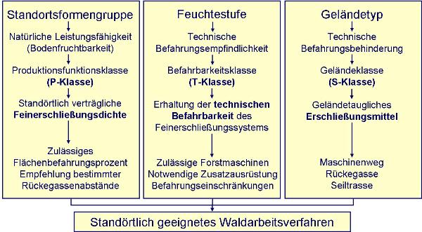 Durch eine einfache Bewertungsmatrix kann jede forstökologische Standortseinheit eindeutig einer modifizierten forsttechnischen Standortsklasse zugeordnet werden. „Modifiziert“ bedeutet, dass auch der Wert des Waldbodens, der für ein permanentes Feinerschließungssystem aus der biologischen Produktion genommen wird, bei der Wahl des Holzernteverfahrens berücksichtigt wird. Zusätzlich erfolgt eine konventionelle forsttechnische Geländeklassifikation mit Hilfe von Hangneigungsstufen und Oberflächenformen (Abb. 1.). Der Grad der technischen Befahrungsbehinderung wird in Form von fünf Geländeklassen bewertet (Abb. 2.). Jeder Geländeklasse (S-Klasse) wird jeweils ein geeignetes Feinerschließungsmittel (Rückegasse in drei Varianten, Maschinenweg, Seiltrasse) zugeordnet.